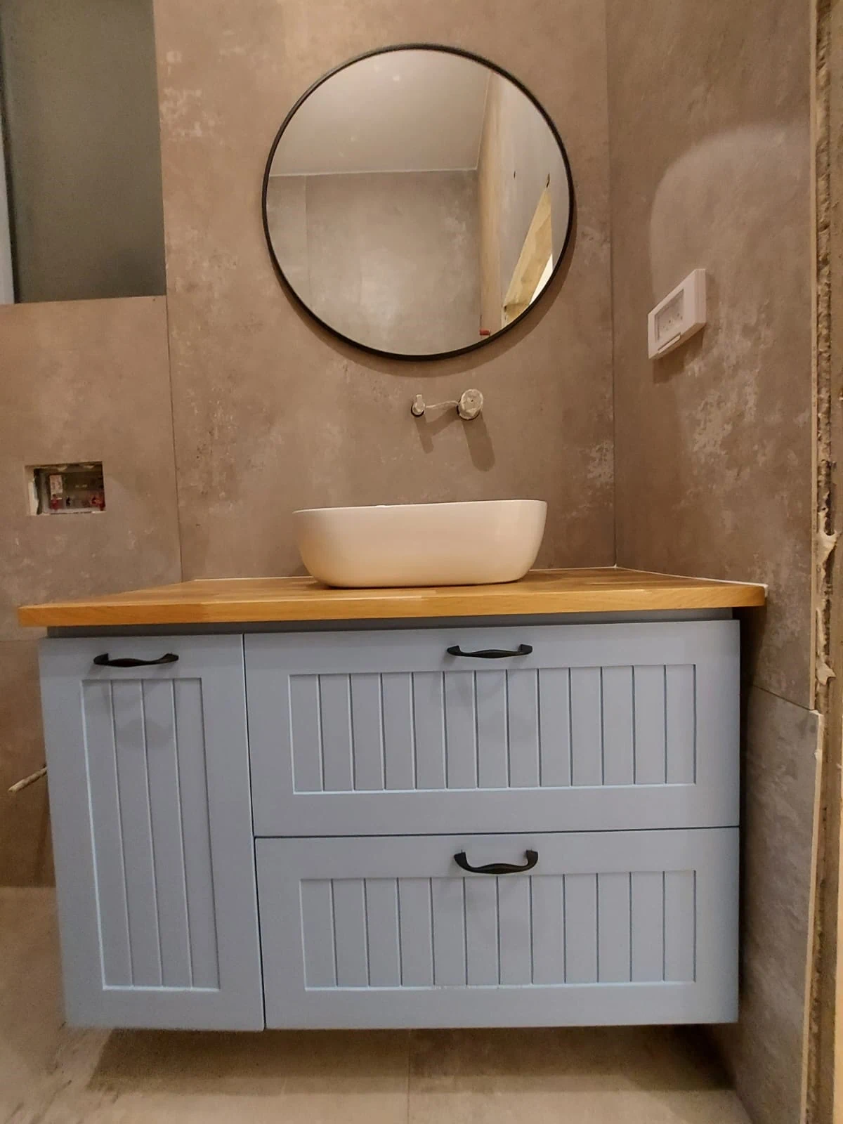 ארון פורניר\ אפוקסי, עץ סנדוויץ', חזית MDF ירוק מותאם לחדרי אמבט ולתנאי לחות.