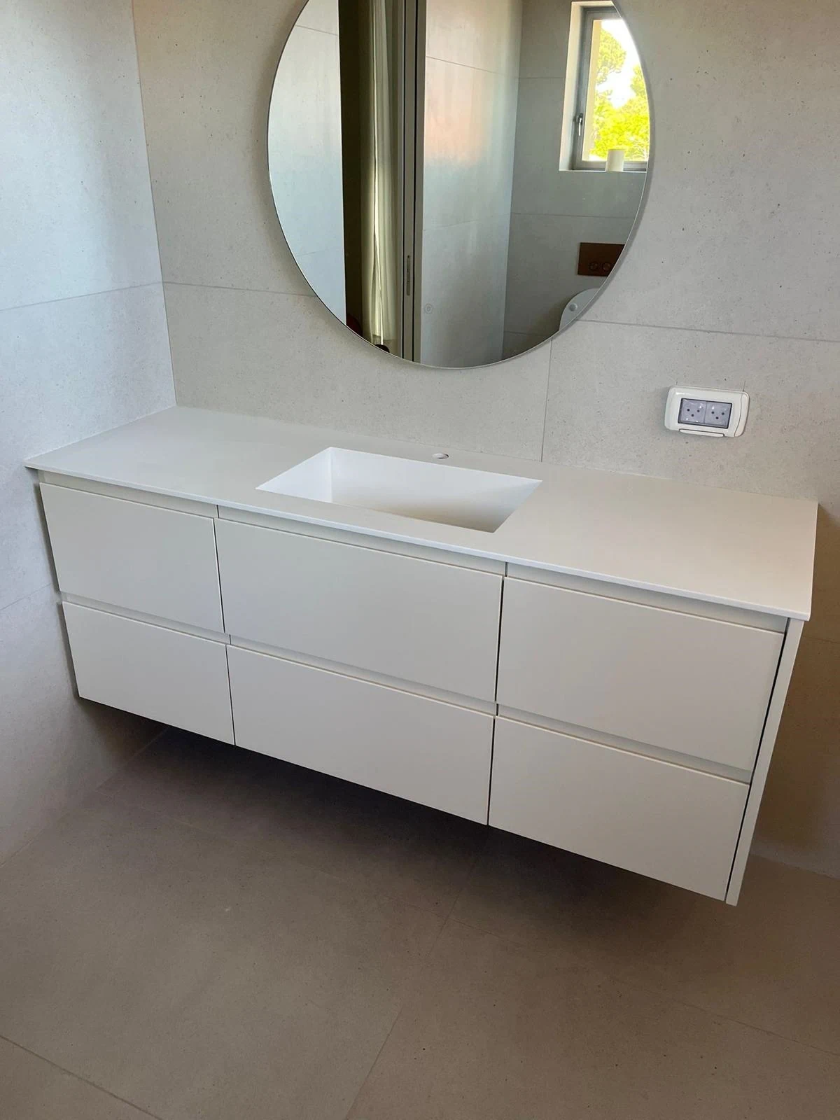 ארון פורניר\ אפוקסי, עץ סנדוויץ', חזית MDF ירוק מותאם לחדרי אמבט ולתנאי לחות.