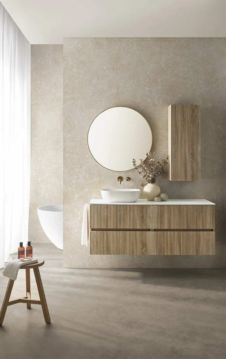 ארון פורניר\ אפוקסי, עץ סנדוויץ', חזית MDF ירוק מותאם לחדרי אמבט ולתנאי לחות.