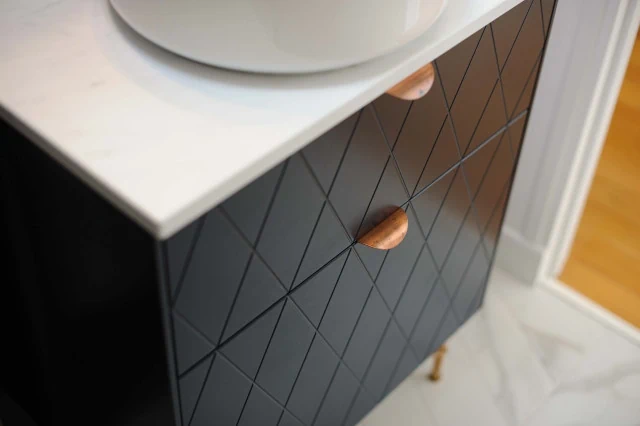 ארון פורניר\ אפוקסי, עץ סנדוויץ', חזית MDF ירוק מותאם לחדרי אמבט ולתנאי לחות.