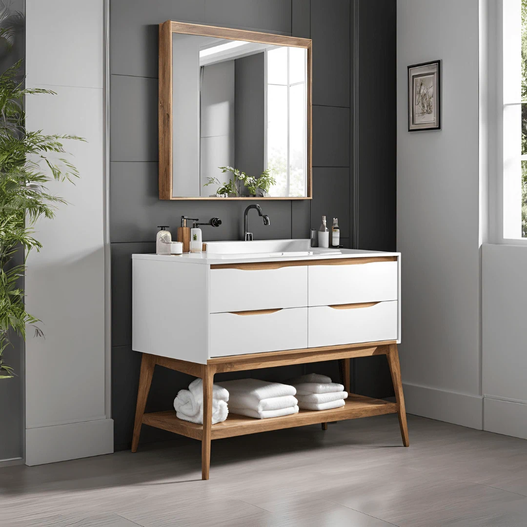 ארון פורניר\ אפוקסי, עץ סנדוויץ', חזית MDF ירוק מותאם לחדרי אמבט ולתנאי לחות.